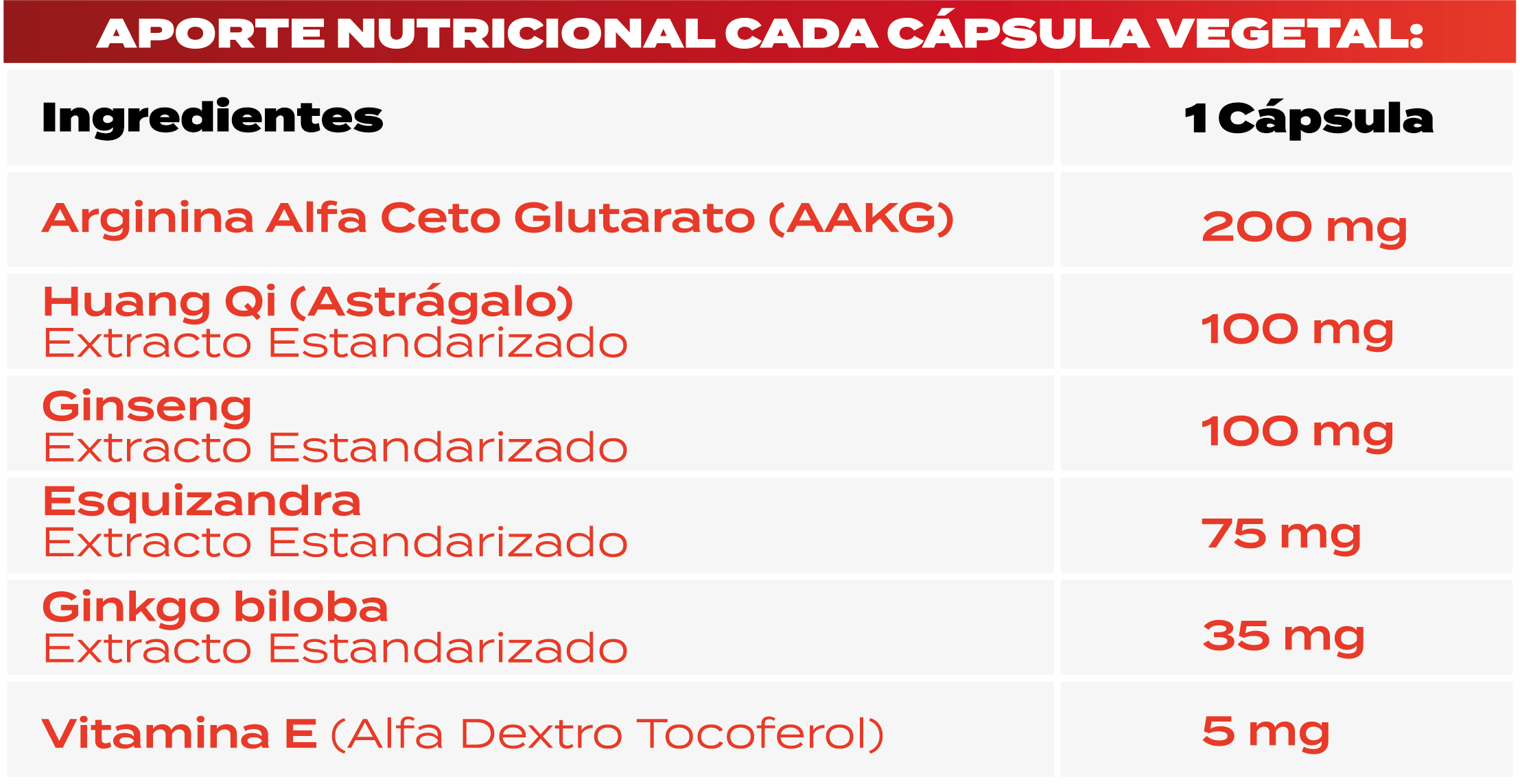 La formulación cuenta con el agregado de Arginina alfa Cetoglutarato (AAKG) original, combinado junto a las hierbas tradicionales chinas estandarizadas y alfa dextro tocoferol de origen natural, ha mostrado sinergia para lograr una actividad más rápida y efectiva.